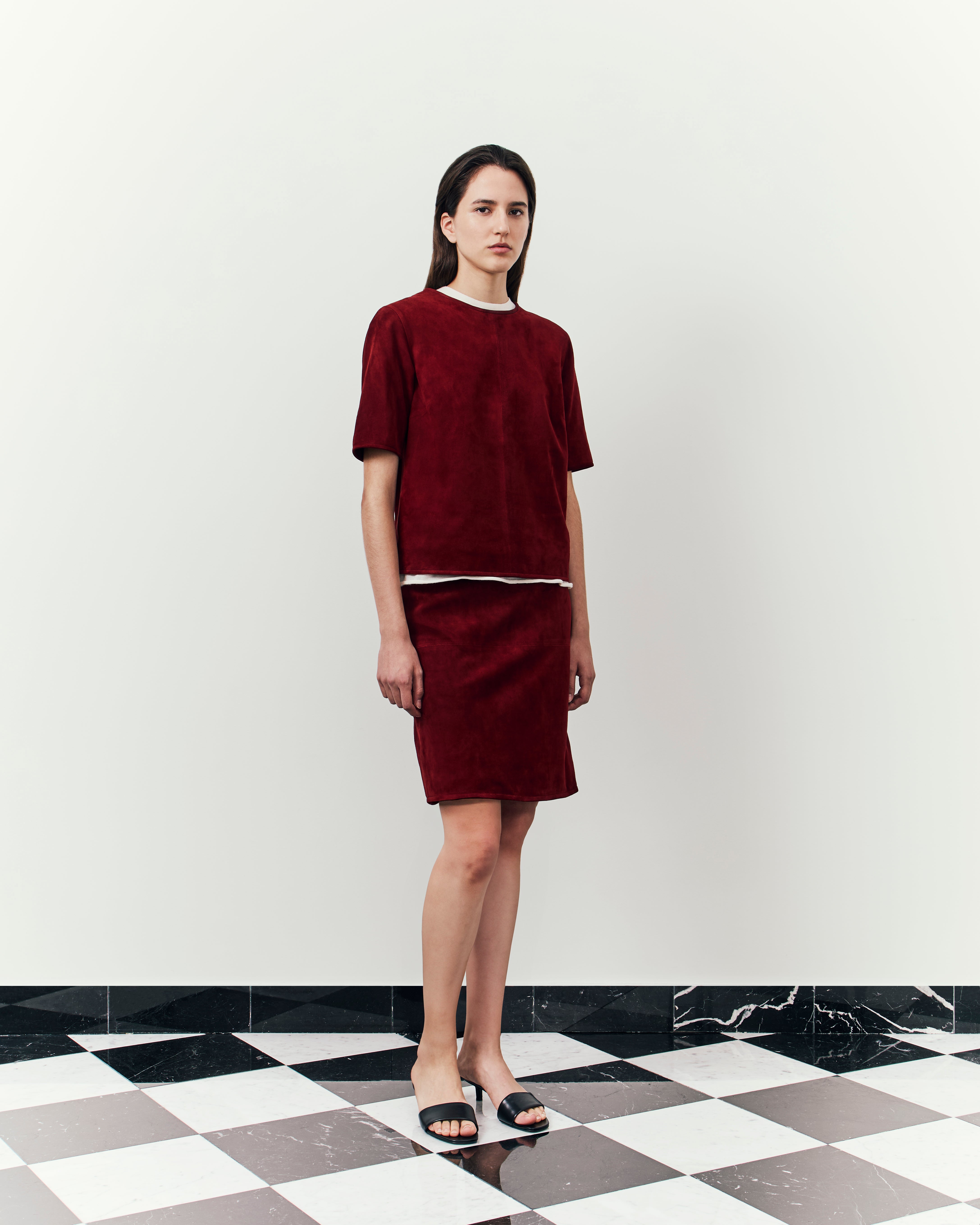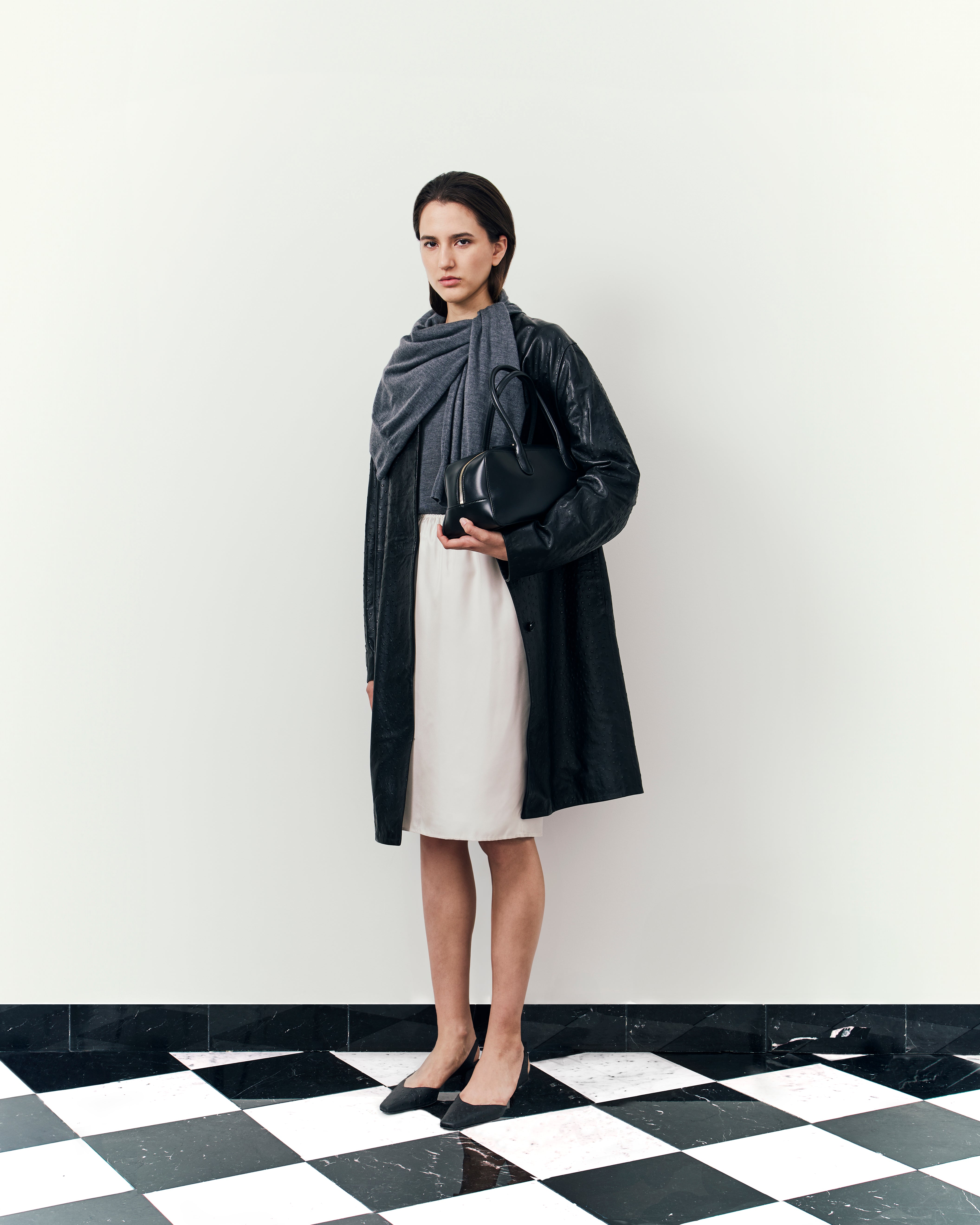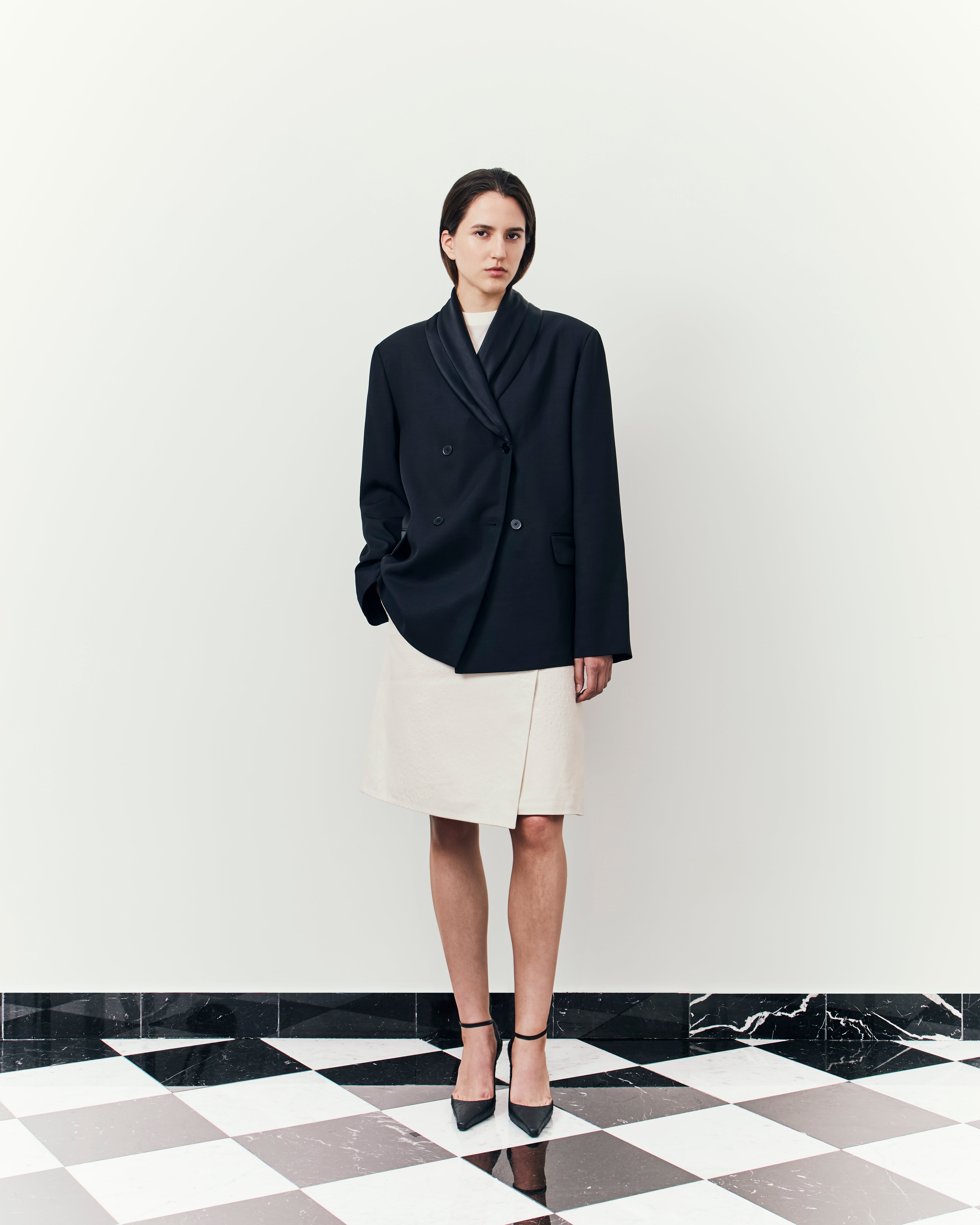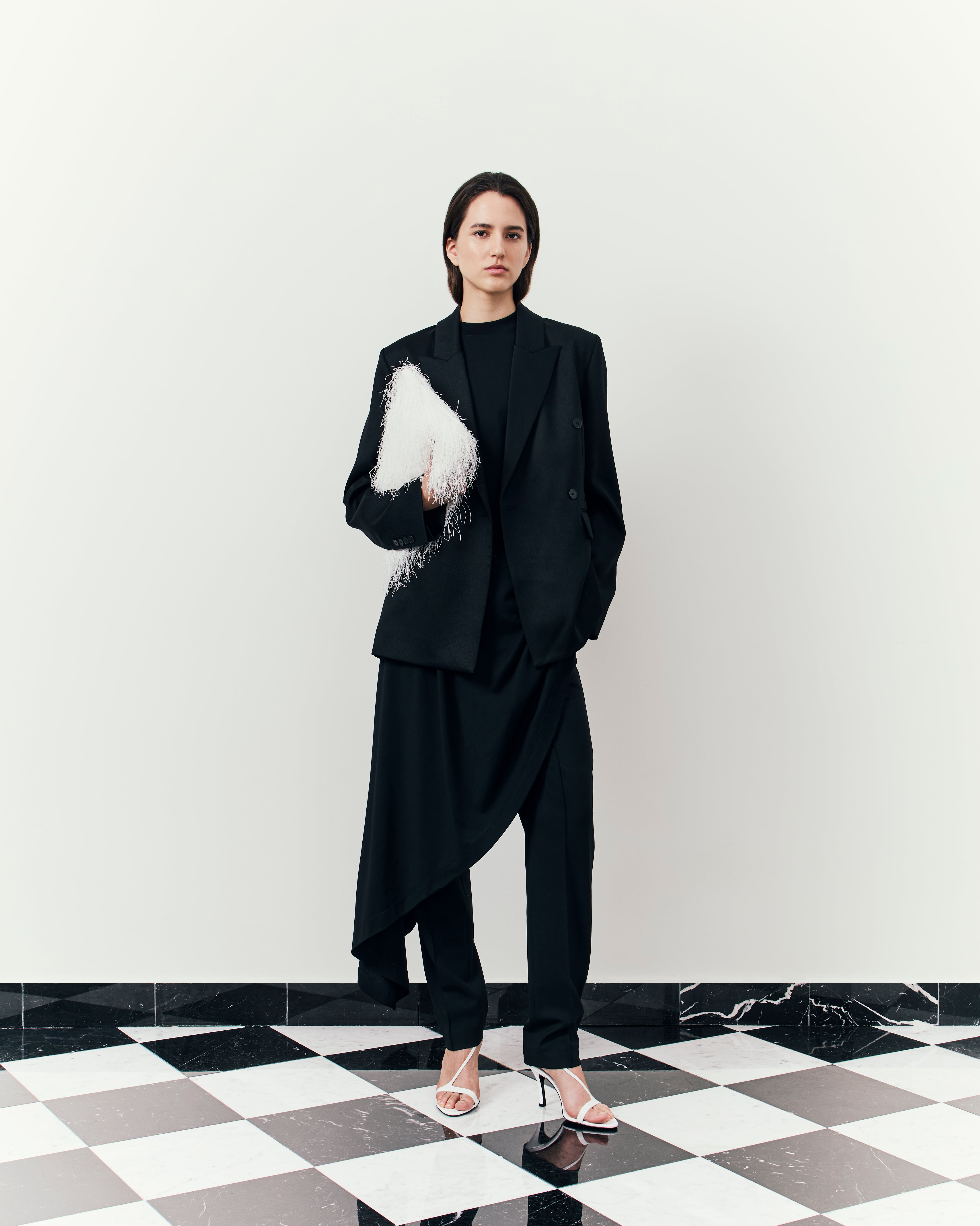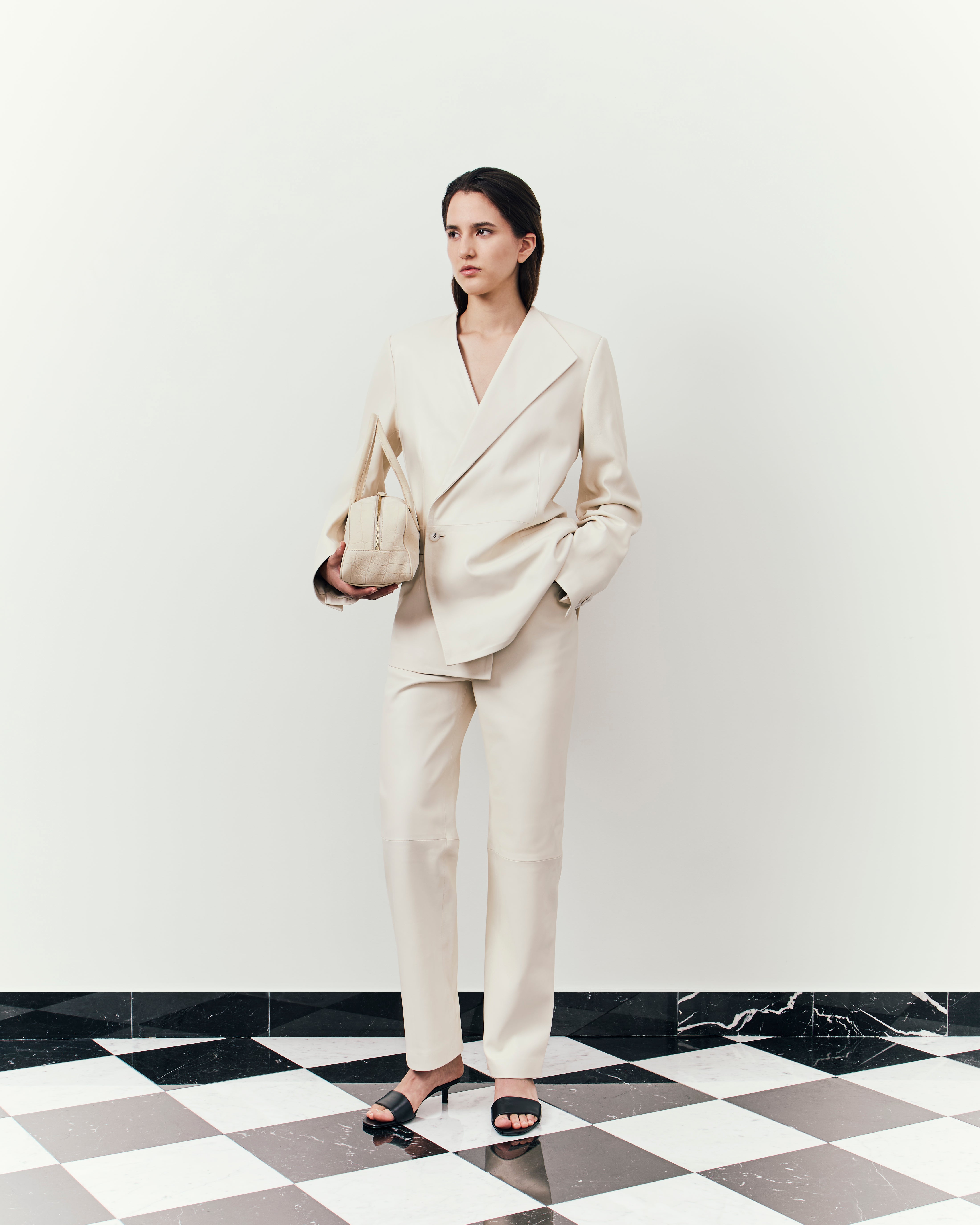 Here, structures sharpen further, deepening with a tactile approach to materials: tailored separates in ostrich-effect leather, hefty satin the base of boxy evening jackets, buttery suede expertly cut into roomy overcoats. The purity of lines and a restraint on the palette, the collection channels a descent into our sense of self: deliberate, intimate, and pared back.