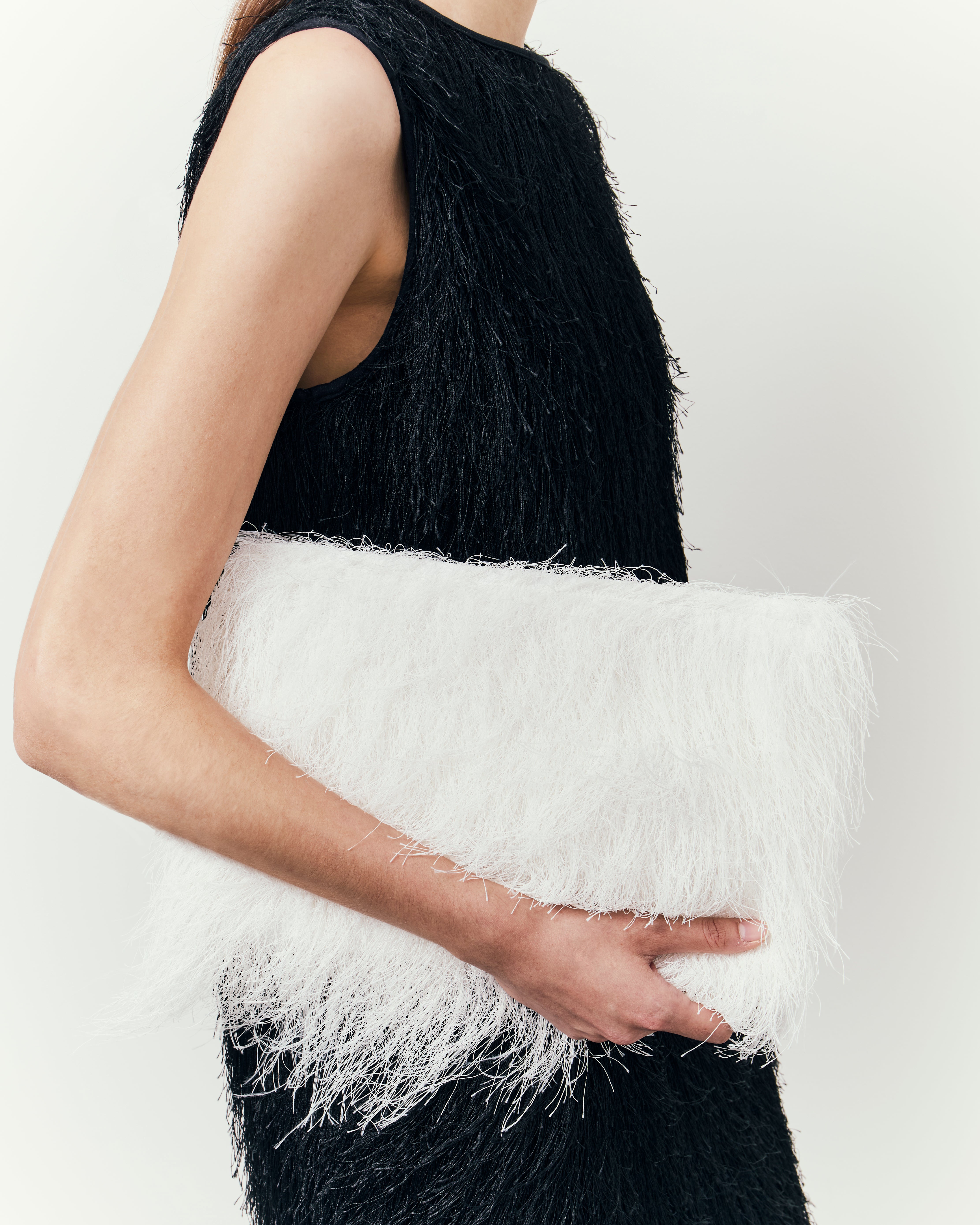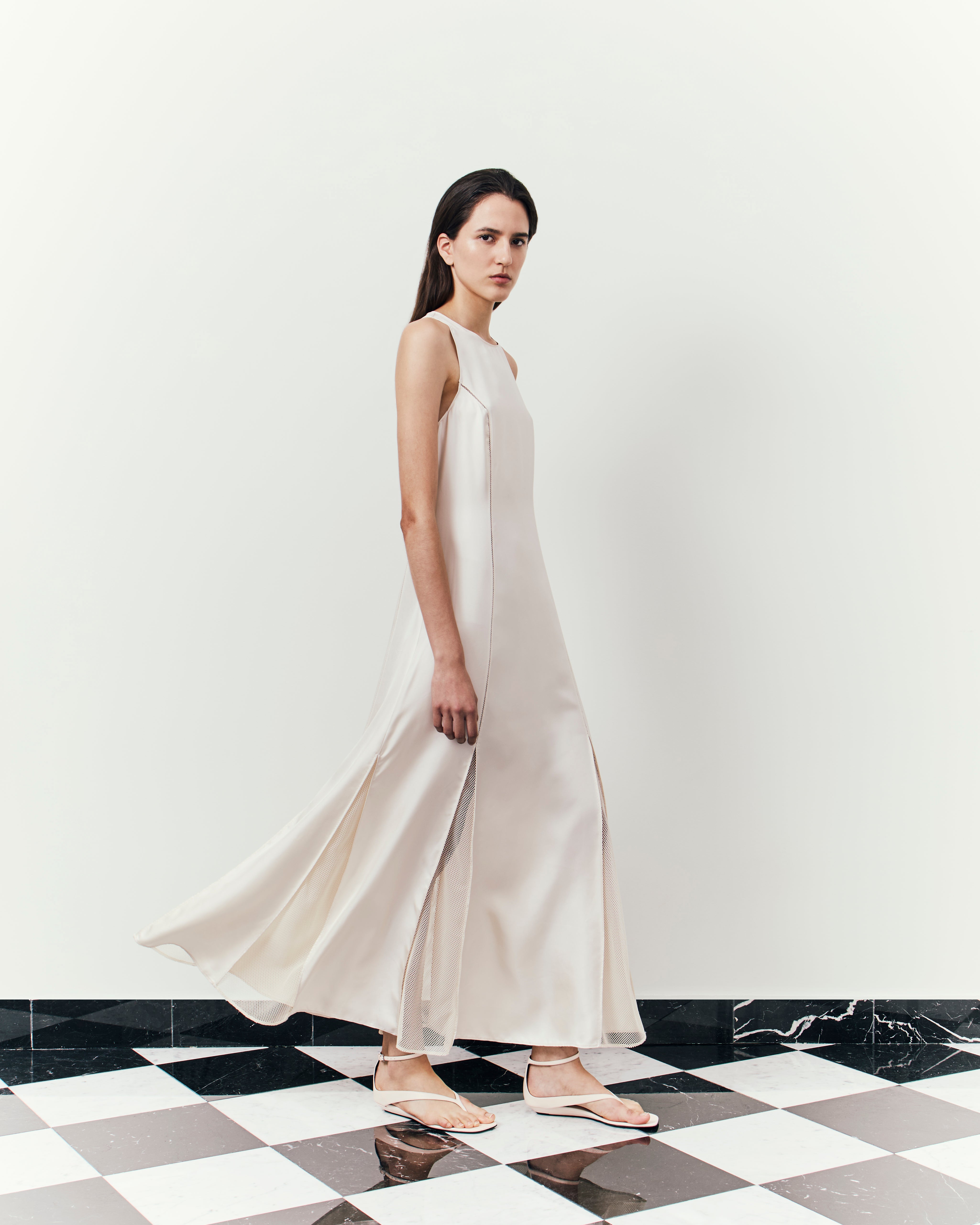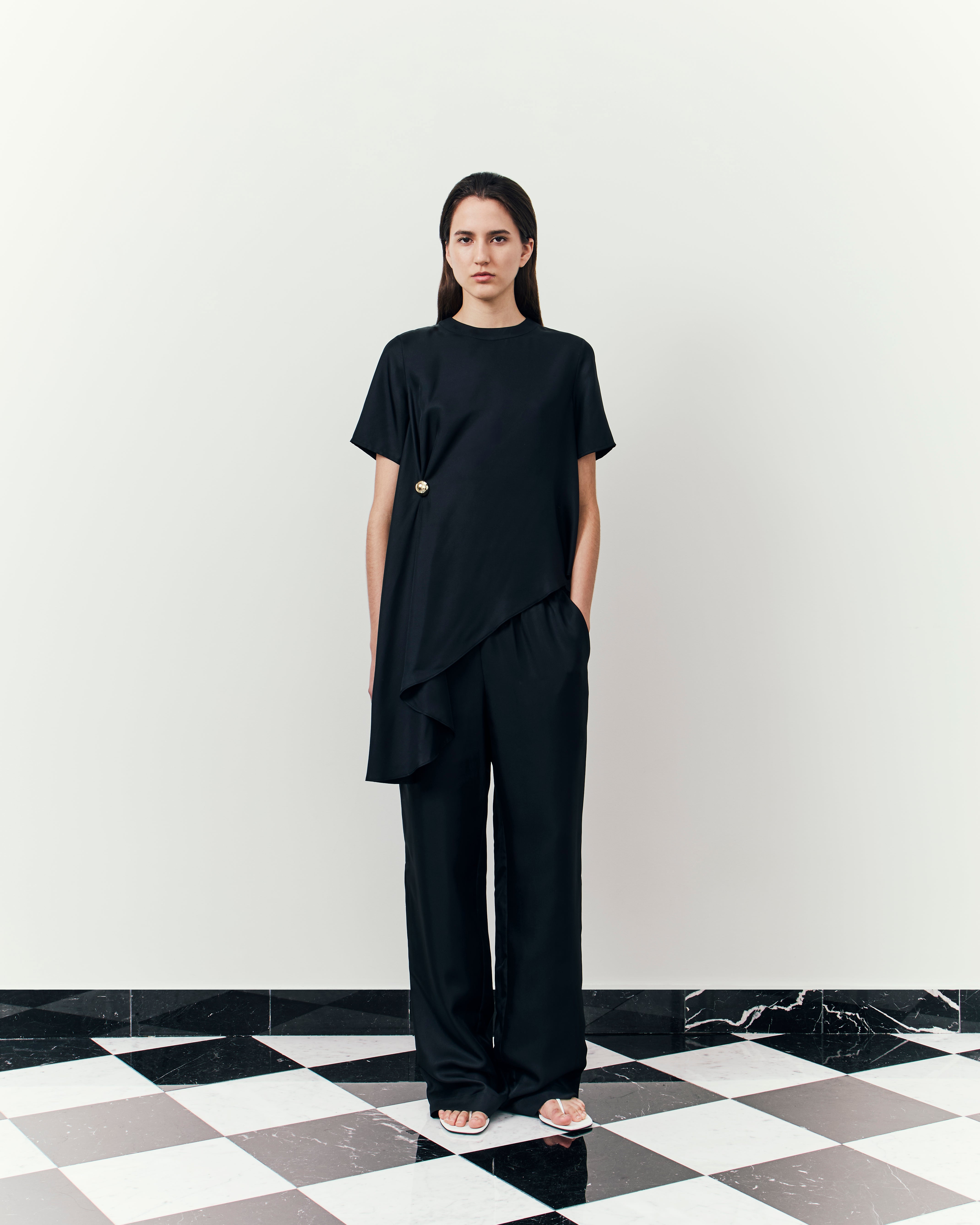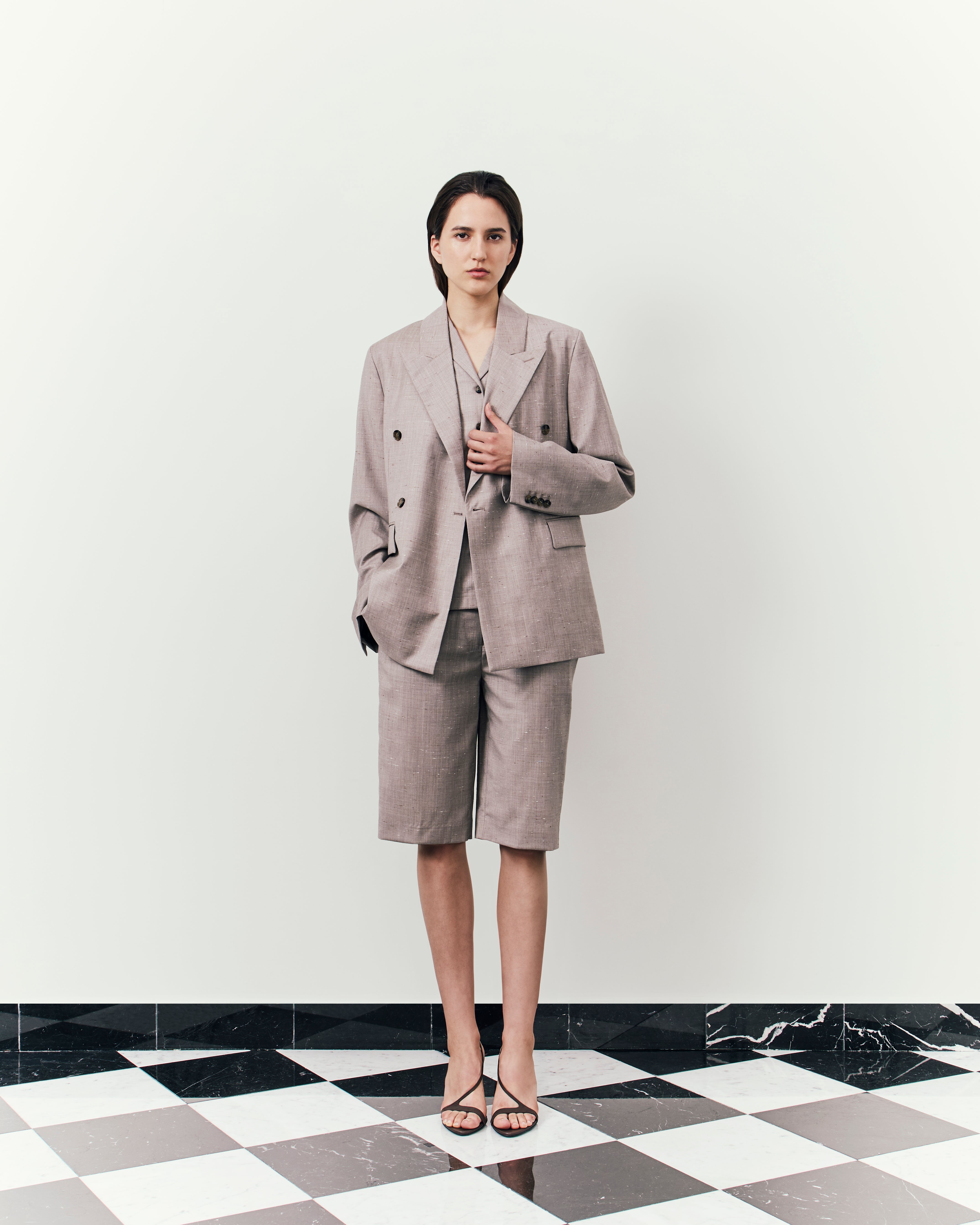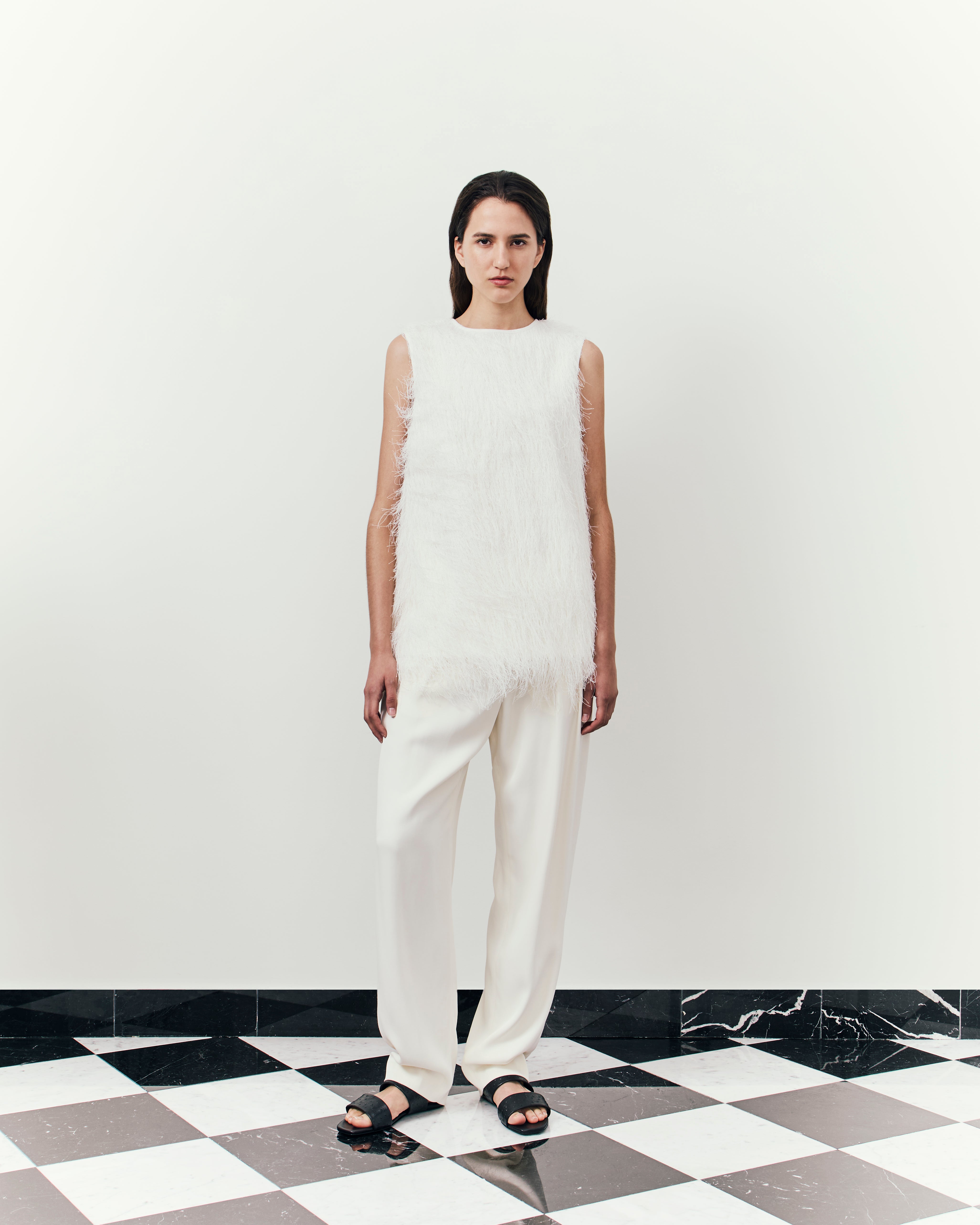 Here, structures sharpen further, deepening with a tactile approach to materials: tailored separates in ostrich-effect leather, hefty satin the base of boxy evening jackets, buttery suede expertly cut into roomy overcoats. The purity of lines and a restraint on the palette, the collection channels a descent into our sense of self: deliberate, intimate, and pared back.