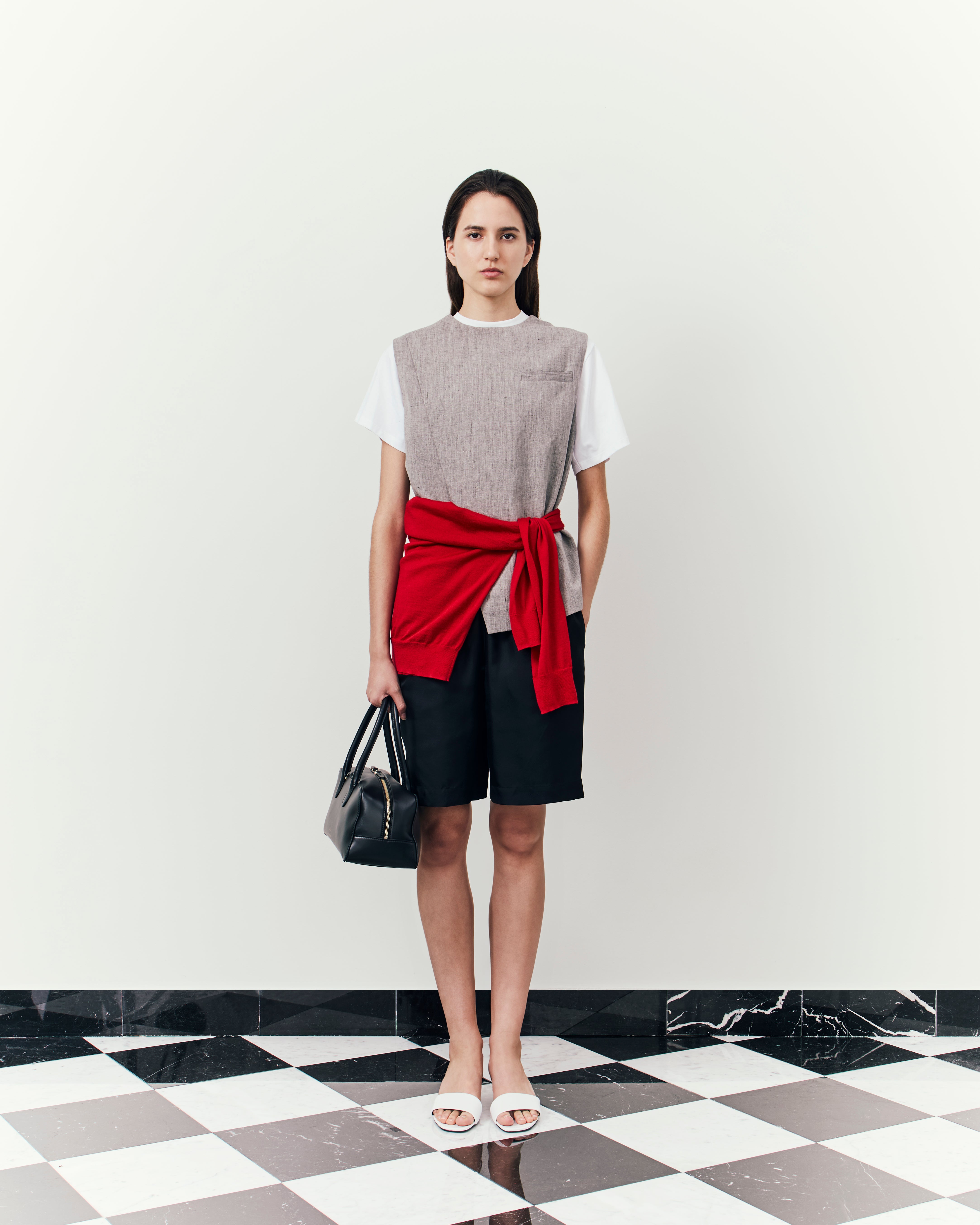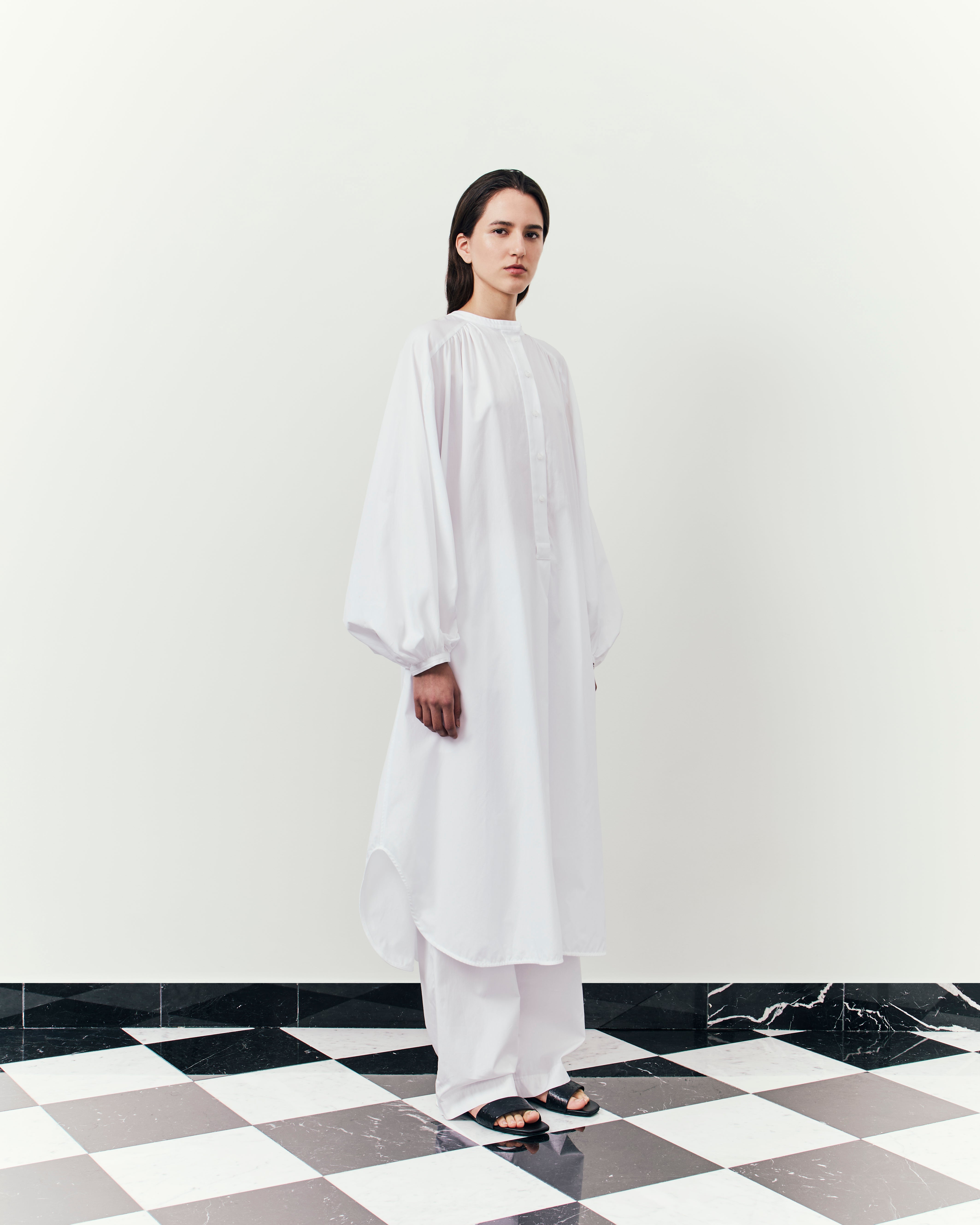 This tension unfolds in a series of airy silhouettes that seem to float but are held together by sharpness. Short, tailored trousers and crisp poplin shirts blend Hepburn’s boyish charm with the ease of summer, but also suggest a quiet refusal to yield. Collarless, cocoon-shaped outerwear, a signature of the Loulou wardrobe, returns with softened volume, reimagined as a form of quiet protection. Elegance as resistance, garments taking over where words and emotions might have failed us.
